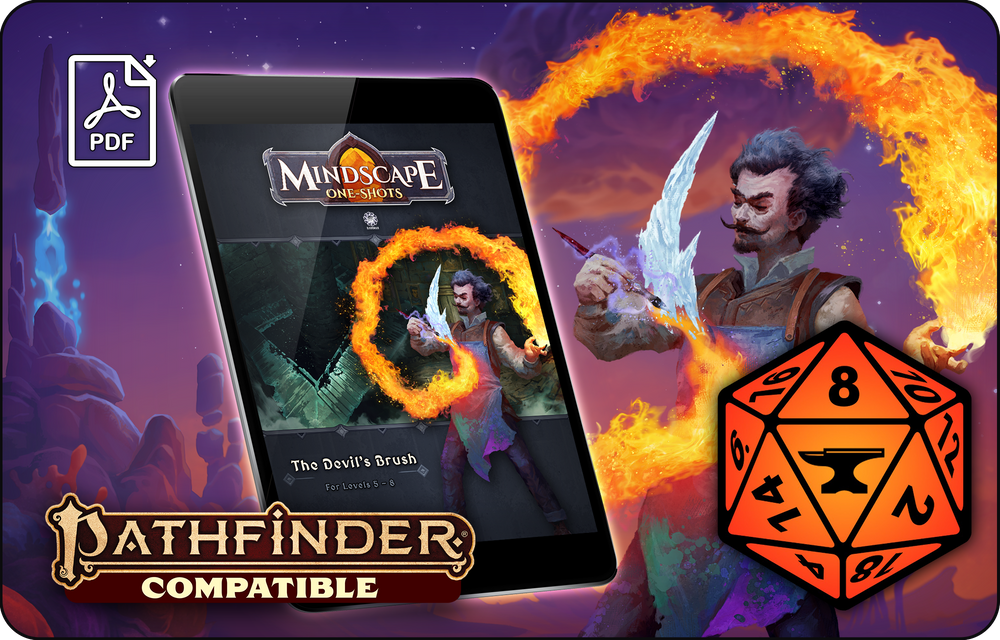 In this one-shot horror dungeon, characters descend into a painted world crafted by a man unraveling into madness. Rooms shift, pigment bleeds from the walls, and reality warps stroke by stroke. Each chamber is a defense — surreal, lethal, and alive with infernal intent. At its heart, the Brush of Moal’dax waits, seeking a new hand to guide it... and new lives to paint away.