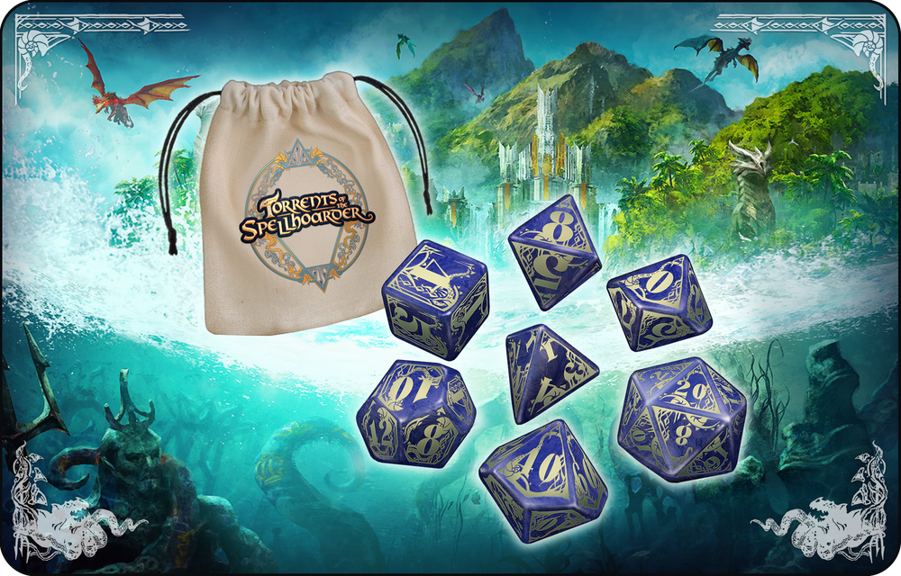We are happy to introduce our newest addition to your dice collection: the Torrents of the Spellhoarder Dice Set, themed after our high-level seafaring adventure.